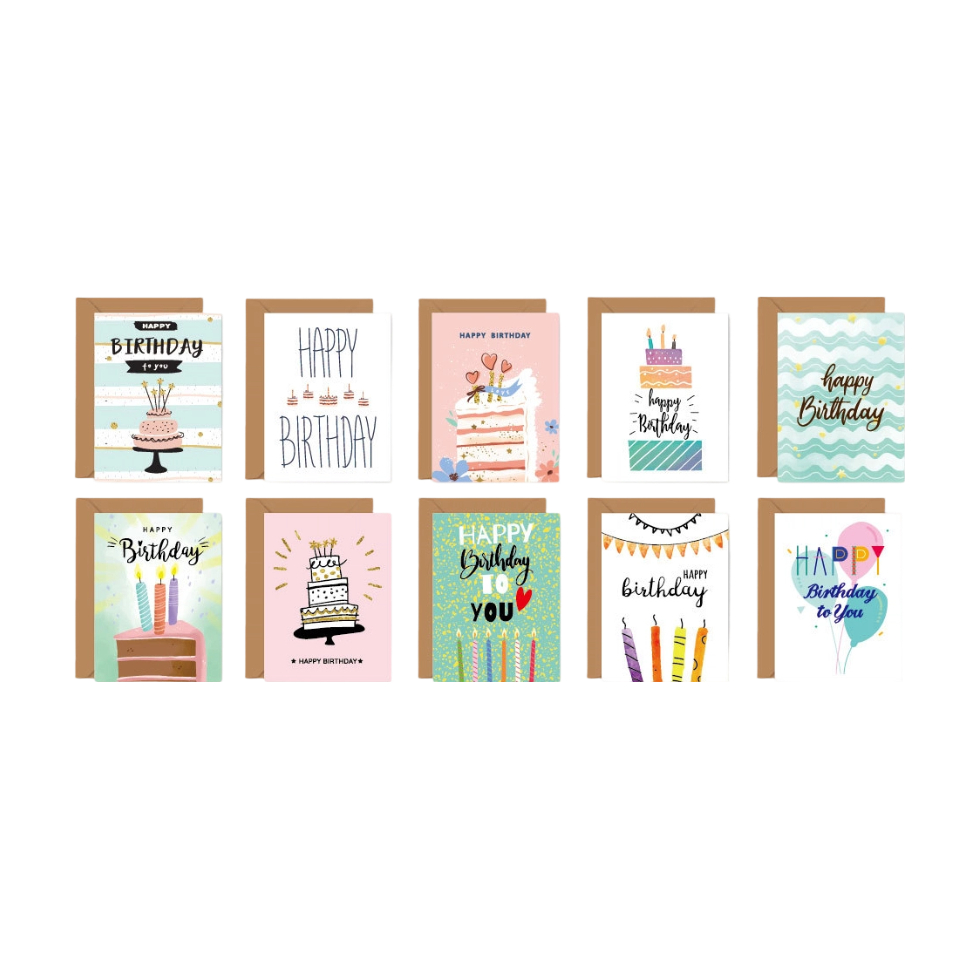 Colorful Assorted Happy Birthday Greeting Cards with Kraft Envelopes-Balloon&Cake Designs