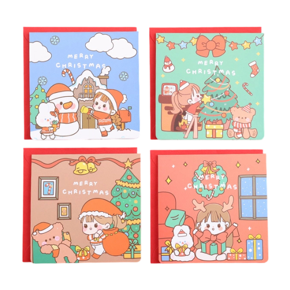Kawaii Cartoon Girl&Friends Merry Christmas Greeting Cards with Red Envelopes
