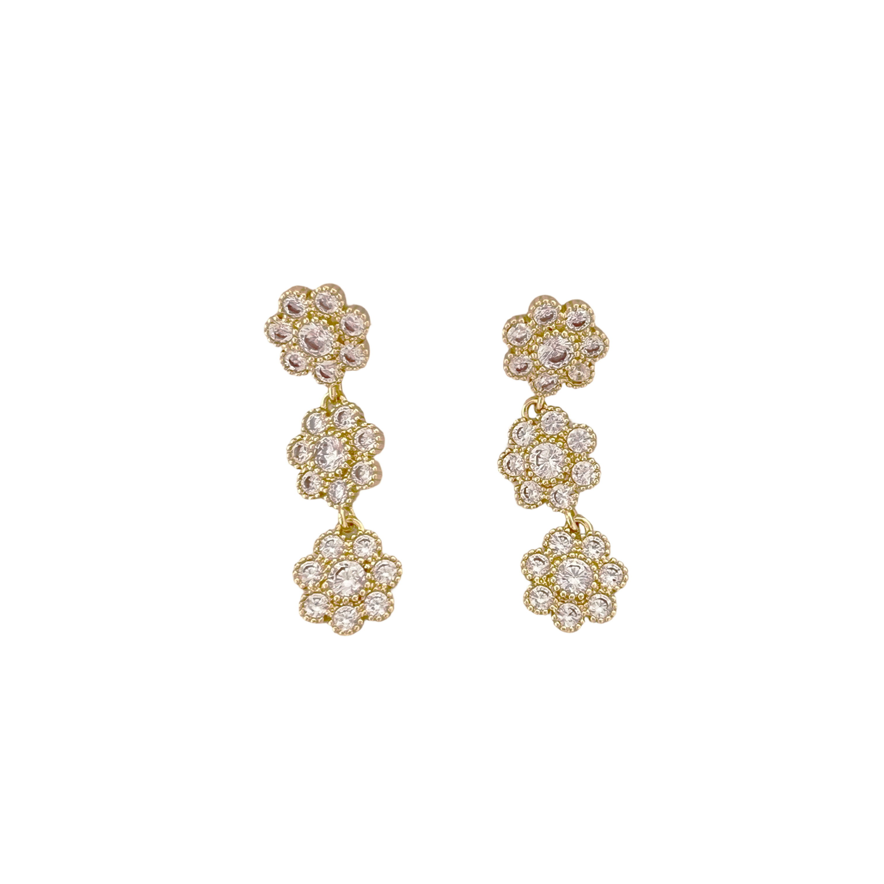 Gold Triple Floral Paved Crystal Drop Earrings