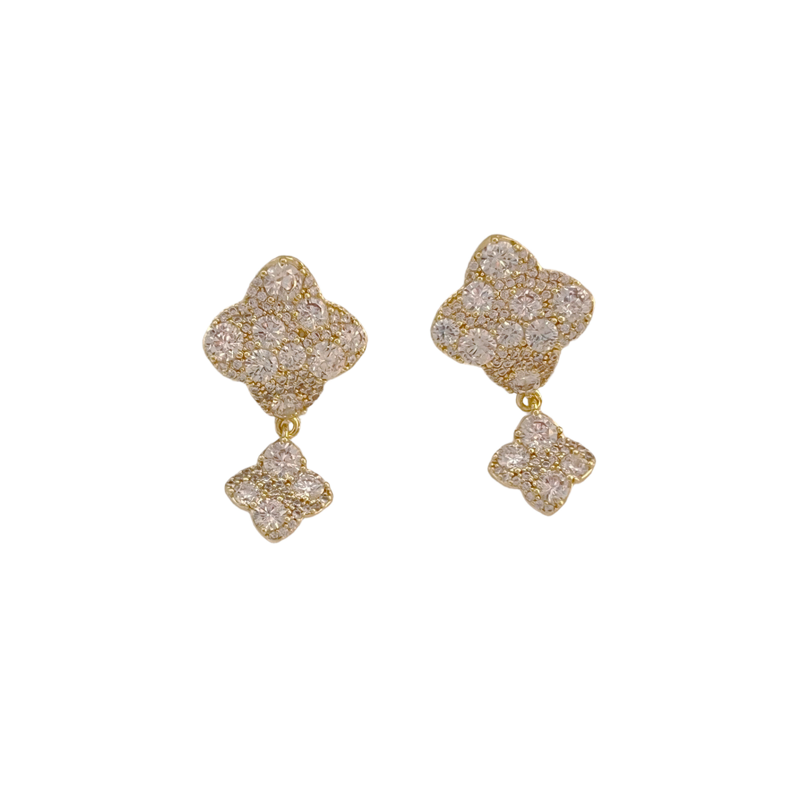 Gold Paved Crystal Double Four-Leaf Clover Drop Earrings