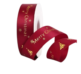 Red Satin Merry Christmas Ribbon with Gold Foil Tree & Snowflake Motifs