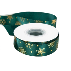 Green Satin Christmas Ribbon with Gold Foil Snowflake Motifs