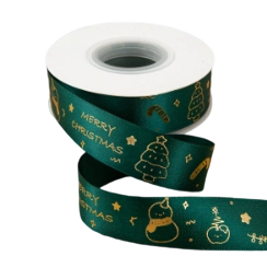 Green Satin Merry Christmas Ribbon with Gold Foil Tree & Candy Cane Motifs