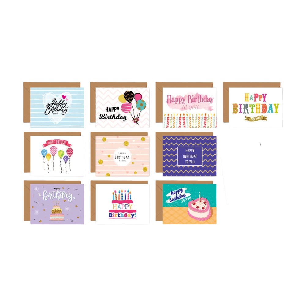 Colorful Assorted Happy Birthday Greeting Cards with Kraft Envelopes-Balloon&Cake Designs