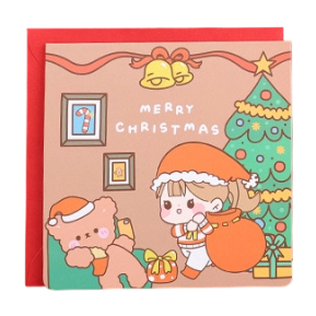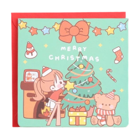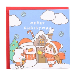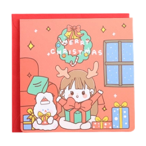 Kawaii Cartoon Girl&Friends Merry Christmas Greeting Cards with Red Envelopes