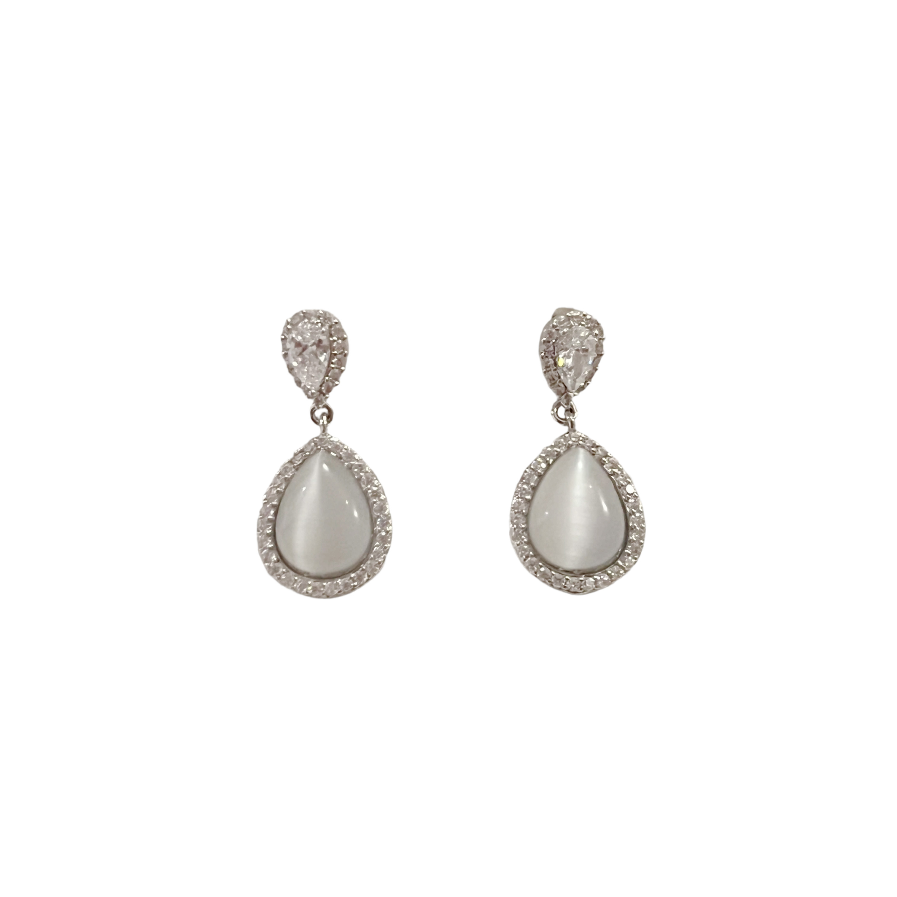 Silver Paved Teardrop Crystal&Cat's Eye Teardrop Drop Earrings